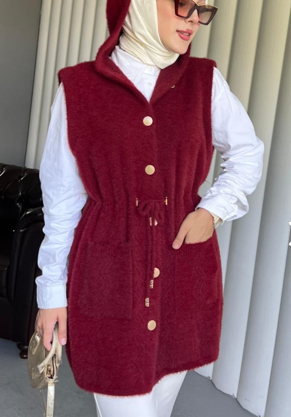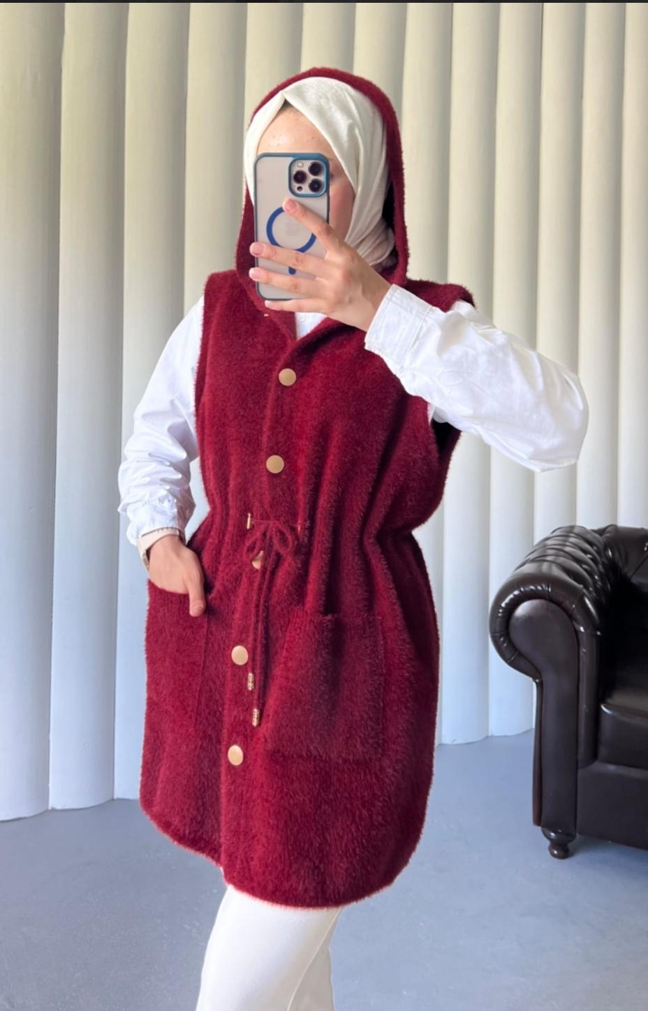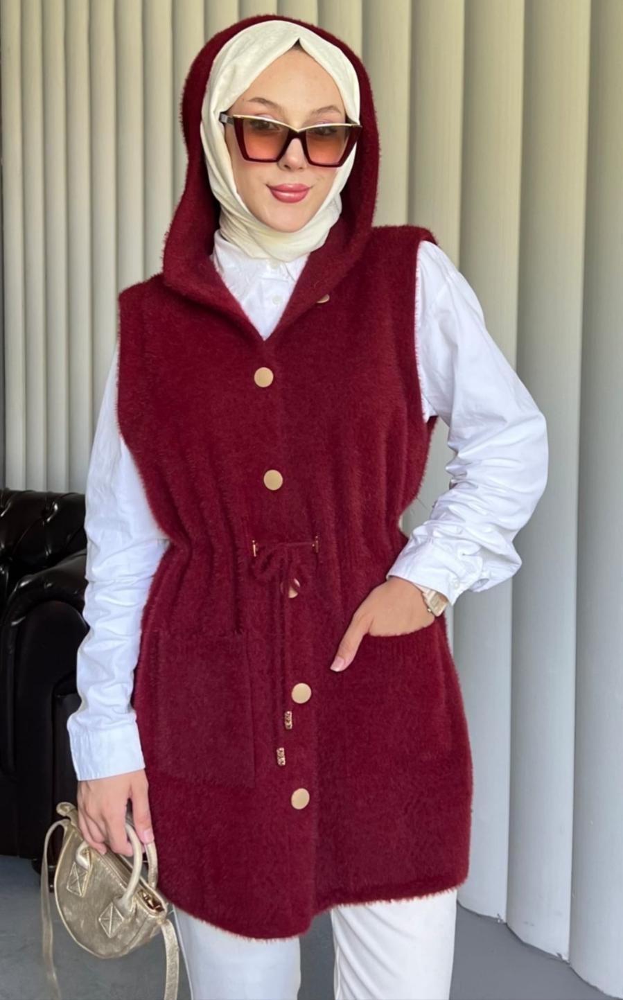 Angora Kapişonlu Yelek - Bordo