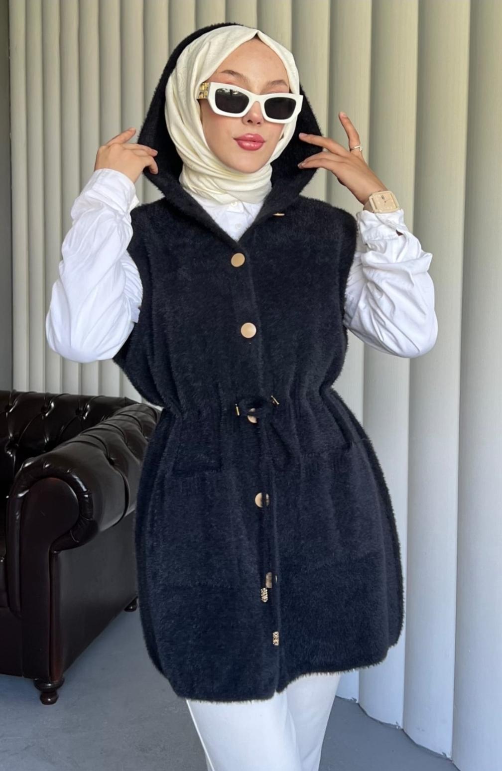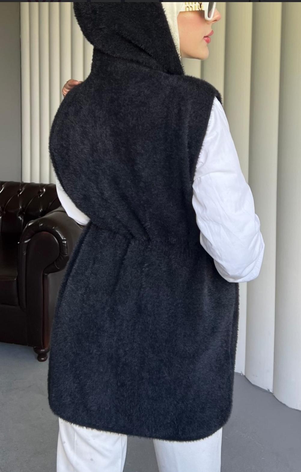 Angora Kapişonlu Yelek - Siyah Renk