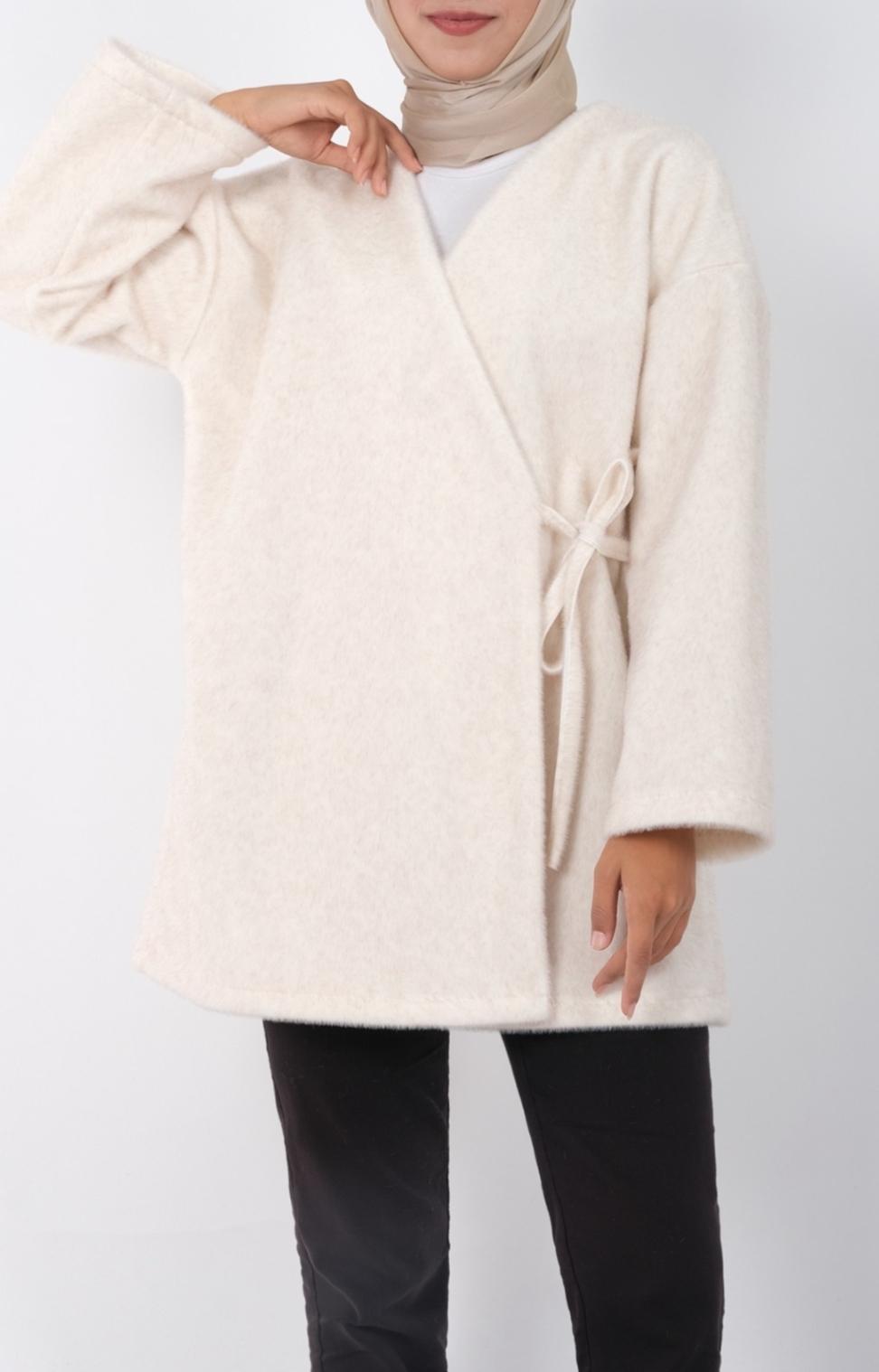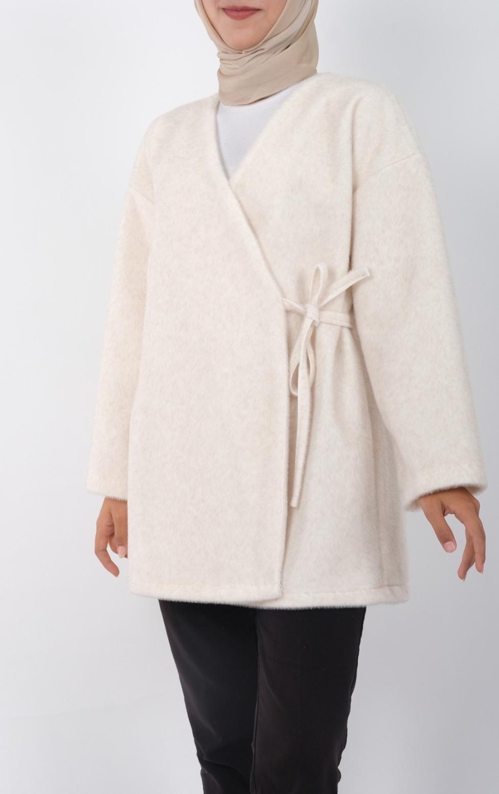 Beli Baglamali Yandan Kürklü Ceket Ekru Renk
