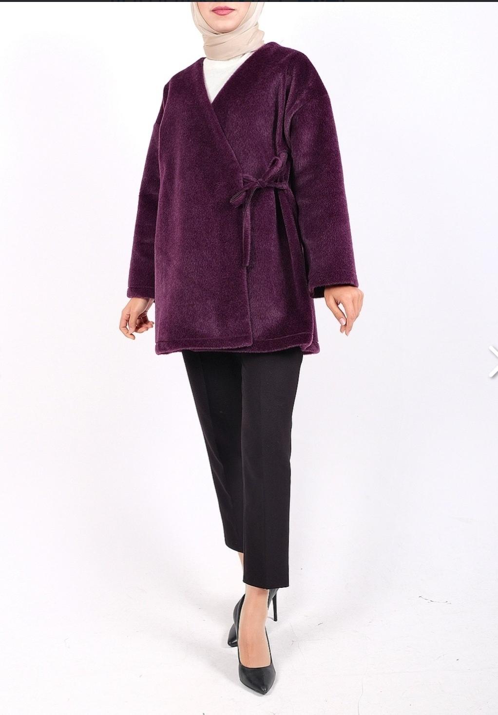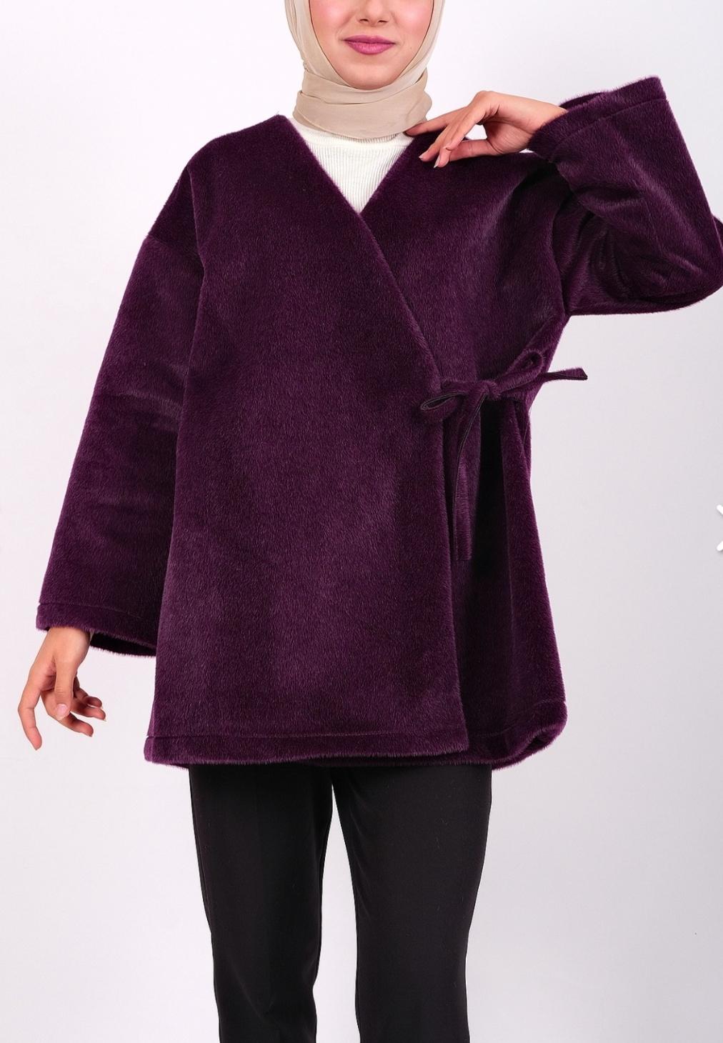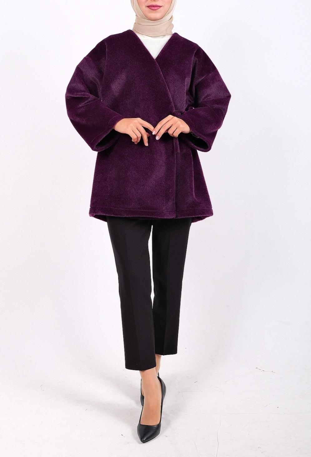 Beli Baglamali Yandan Kürklü Ceket - Mürdüm Renk