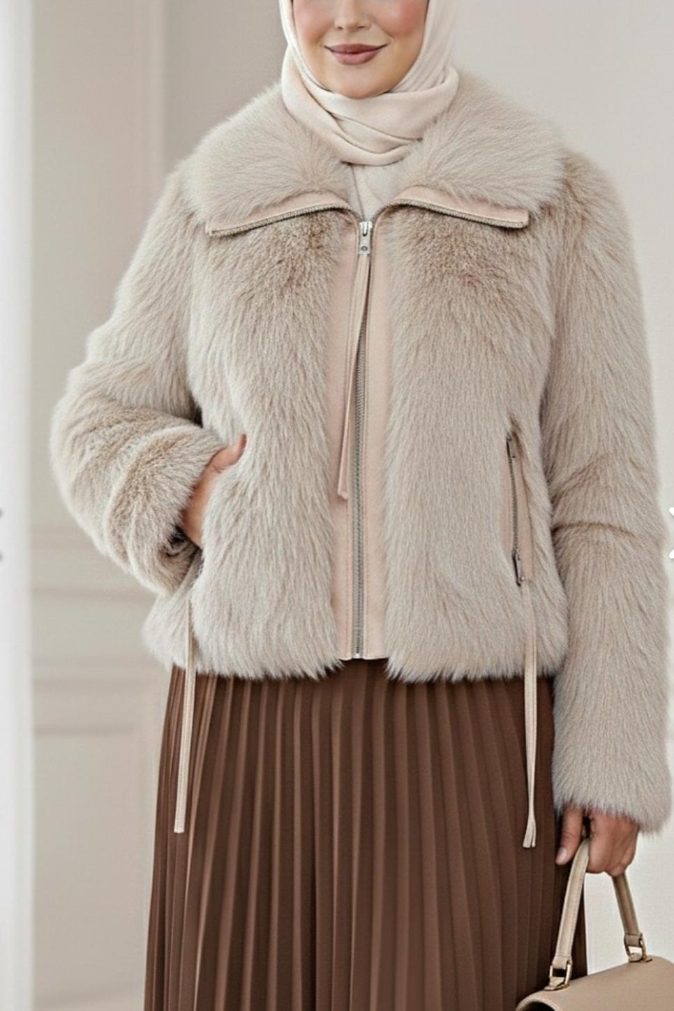 Deri Garnili İçi Astarlı Femuarli İp Detaylı Kürk Mont - Taş Renk
