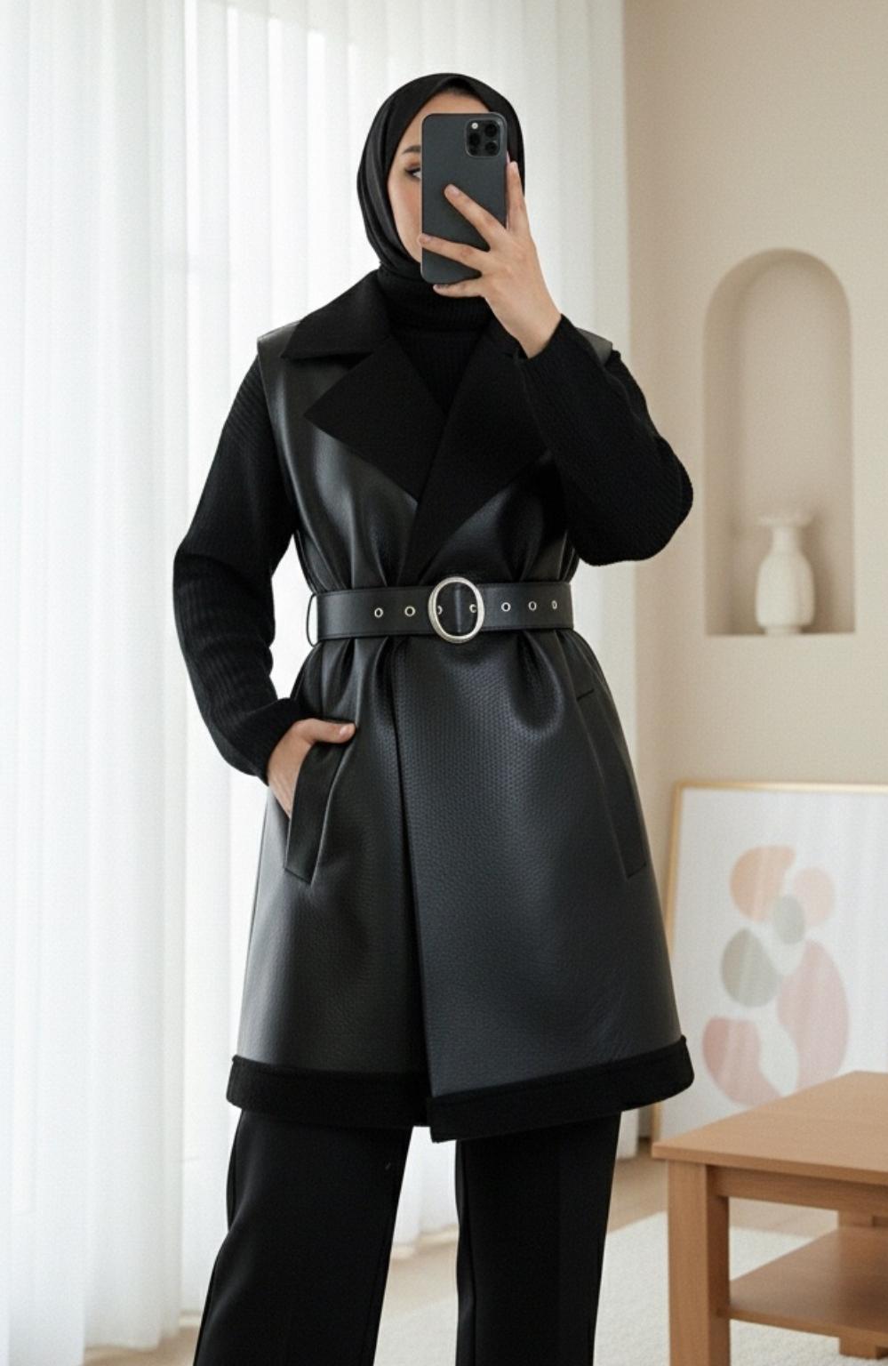 Deri İçi Kuzu Yelek - Siyah Renk