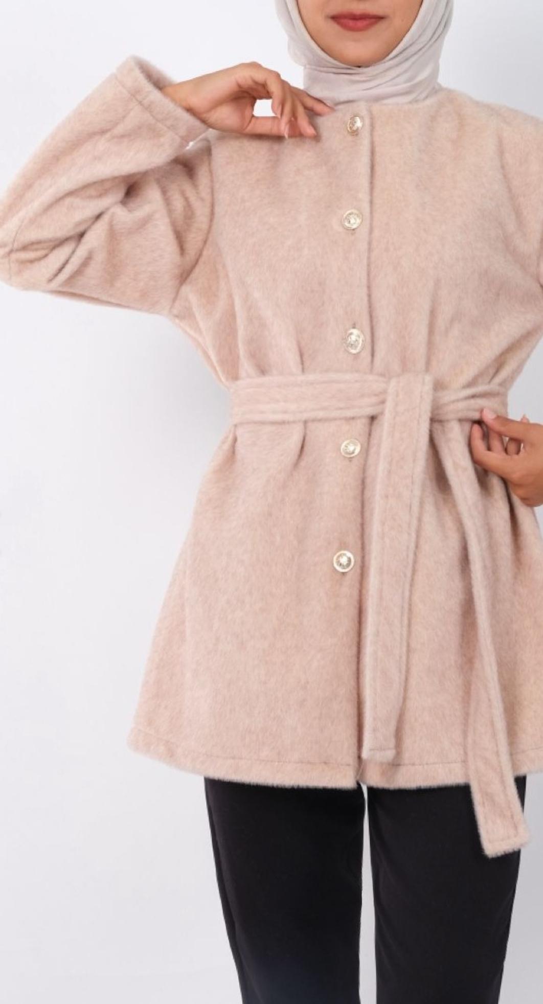 Dügmeli Beli Bağlamalı Kürklü Ceket - Bej Renk