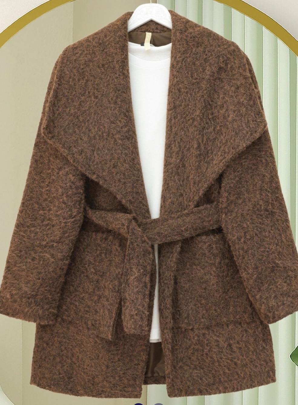 Geniş Yakalı Beli Kemerli Cepli Kaşe Kaban - Kahve Renk