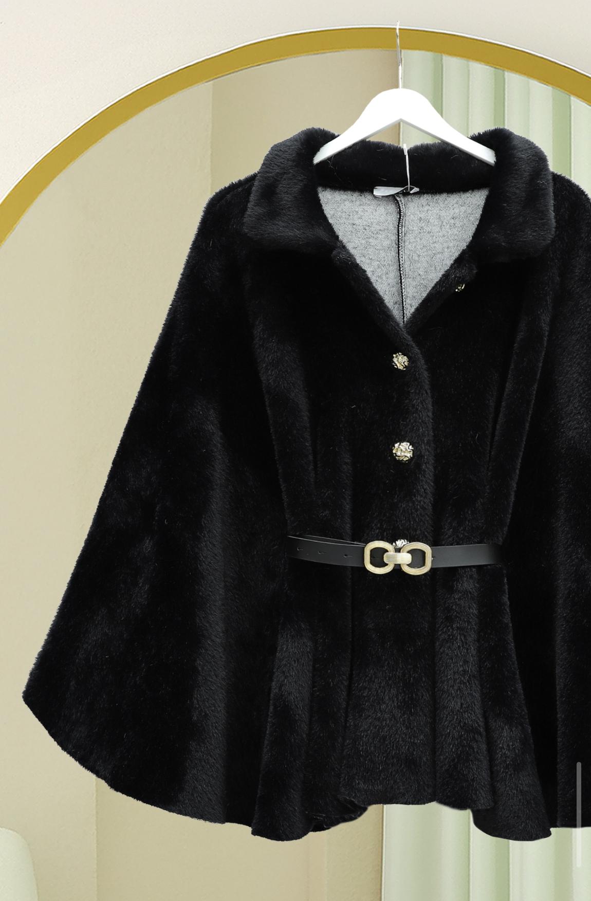 Gold Düğme Detay Kemerli Alcantara Panço - Siyah Renk STD Beden