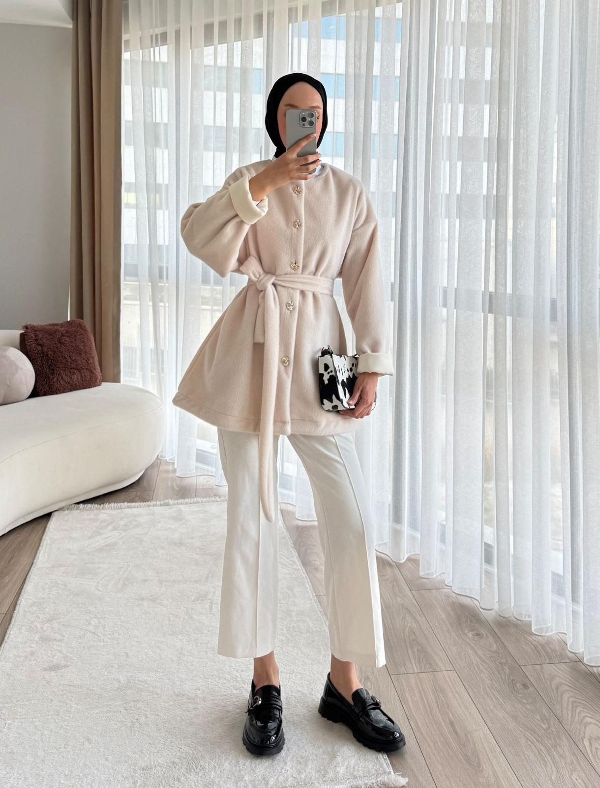 Gold Dügmeli Beli Bağlamalı Kürk Ceket - Ekru Renk
