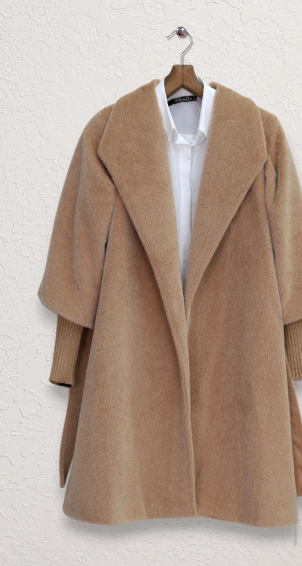 Kolu Ribanalı Şal Yaka Astarli Kaşe Kaban Bej Renk