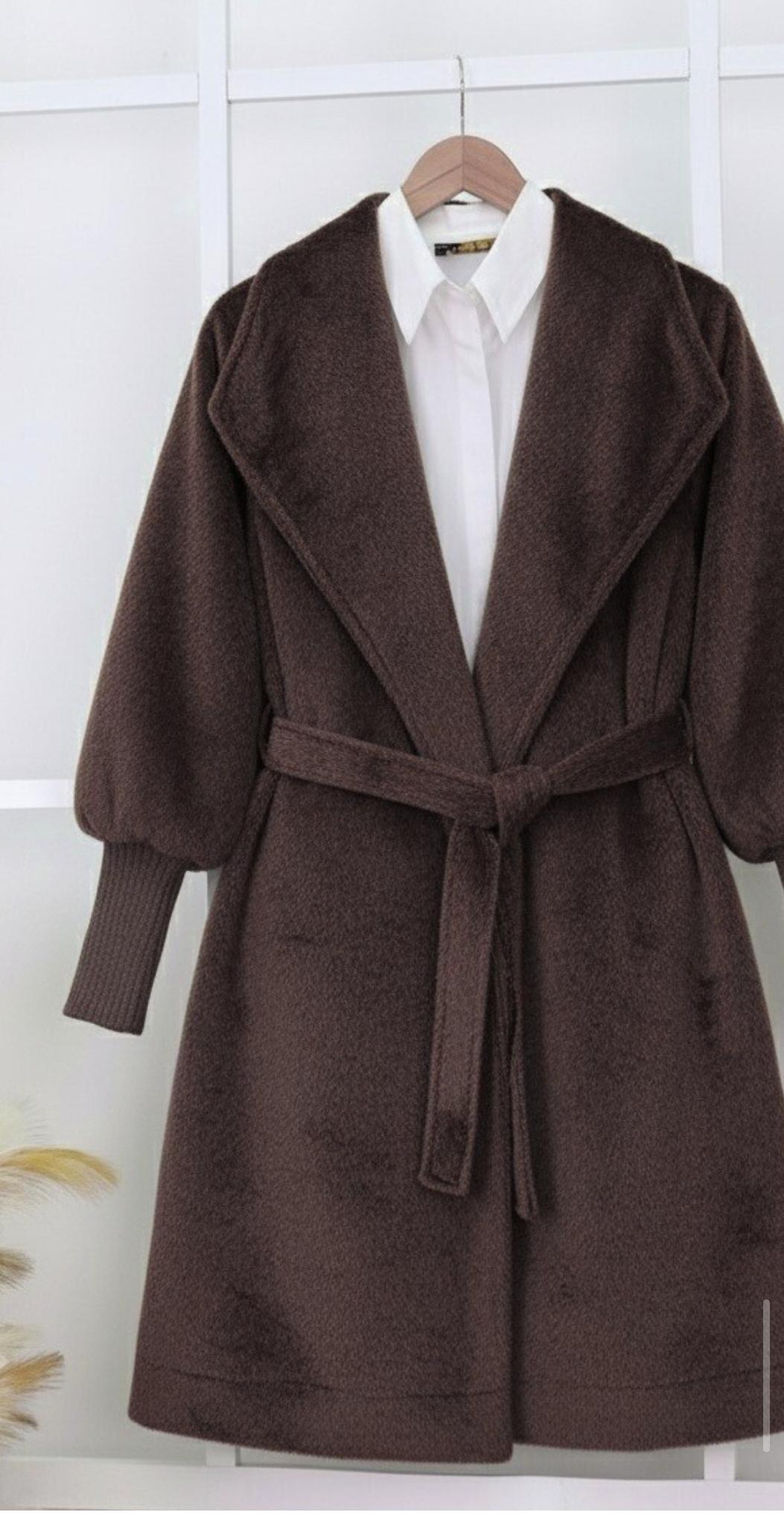 Kolu Ribanalı Şal Yaka Astarli Kaşe Kaban - Kahve Renk