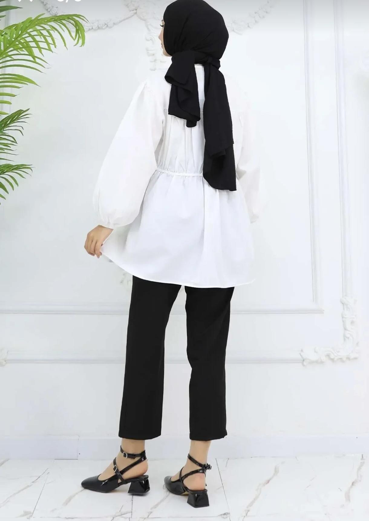 Beyaz tunik gömleğin tasarımı, minimalist ve modern bir hava katacak şekilde sade tutulmuştur. Dikey dikiş detayları, vücut hatlarını daha zarif gösterecek şekilde konumlandırılmıştır. Göğüs kısmında bulunan küçük cep detayı, hem şık bir dokunuş hem de pratik kullanım imkanı sunuyor. Tunik, belinde yer alan likralı lastik ile hafifçe bel vurgusu yapar, böylece her bedene uyum sağlar.