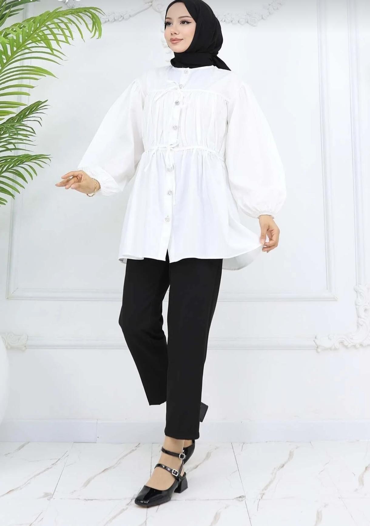 Pamuk beyaz tunik gömlek, çok yönlü kombin olanakları ile dikkat çekiyor. Aşağıda önerilen birkaç kombin örneği ile stilinizi tamamlayabilirsiniz: