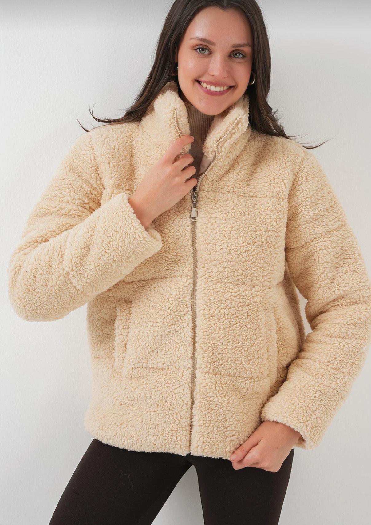 Pilaj görünümlü doku ve zarif krem rengi, mevsim geçişlerinde kullanabileceğiniz ideal bir parça haline getiriyor. Hem resmi hem de günlük giyimde, şıklığınıza şıklık katacak bu peluş mont ile stilinizi tamamlayabilirsiniz. Farklı örtülerle ve aksesuvarlarla kombinleyerek kişisel tarzınızı yansıtacak şekilde stilize edebilirsiniz.